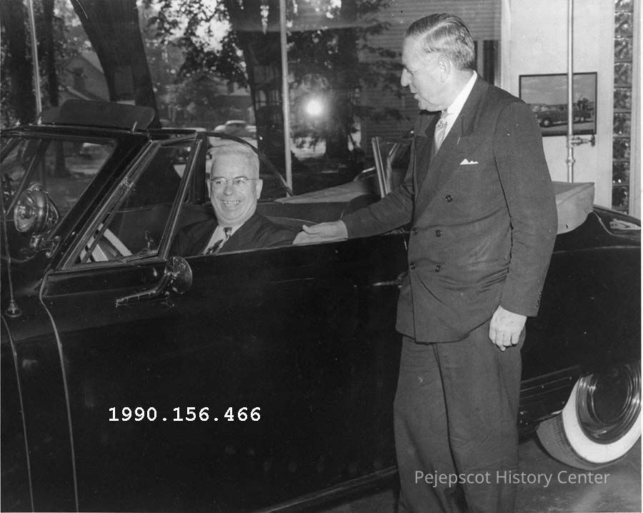 A B/W photograph of Albert Ouellette sitting in a Plymouth convertible in the showroom of his garage on the corner of Elm and Middle Streets. Undated