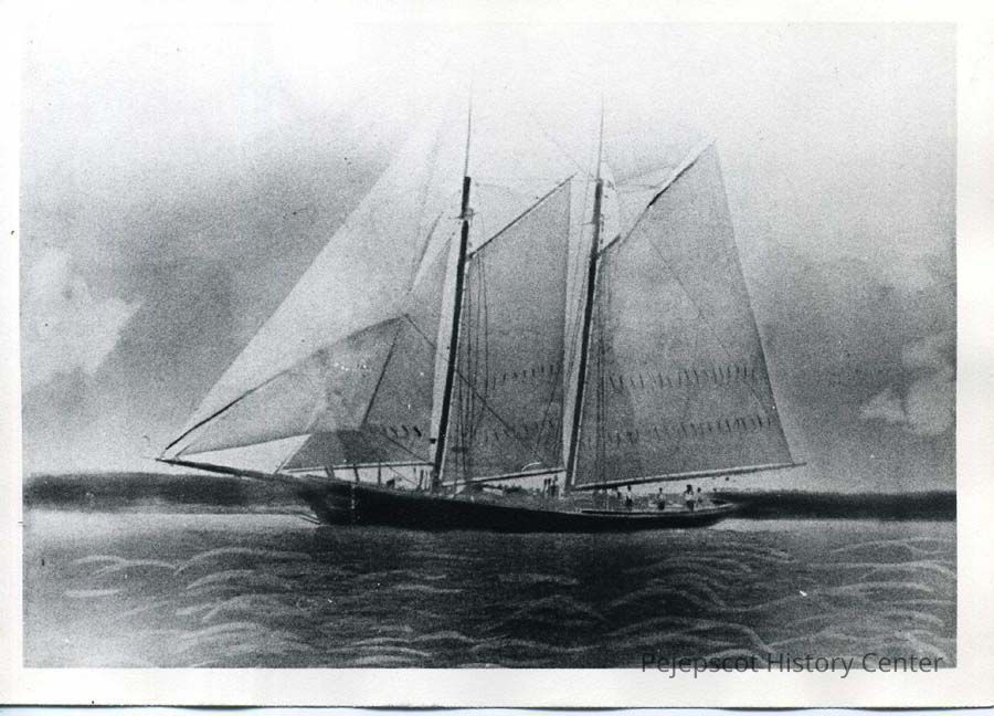 Black & white photograph of a lithograph of the "Schooner Albert T. Black, Orr's Island, Maine, Capt. Harvey Black" (written on back).