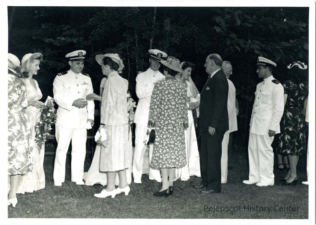 President and Mrs. Sills congratulating John C. Alderman and Nancy Randolph White in the receiving line, July 15, 1943.