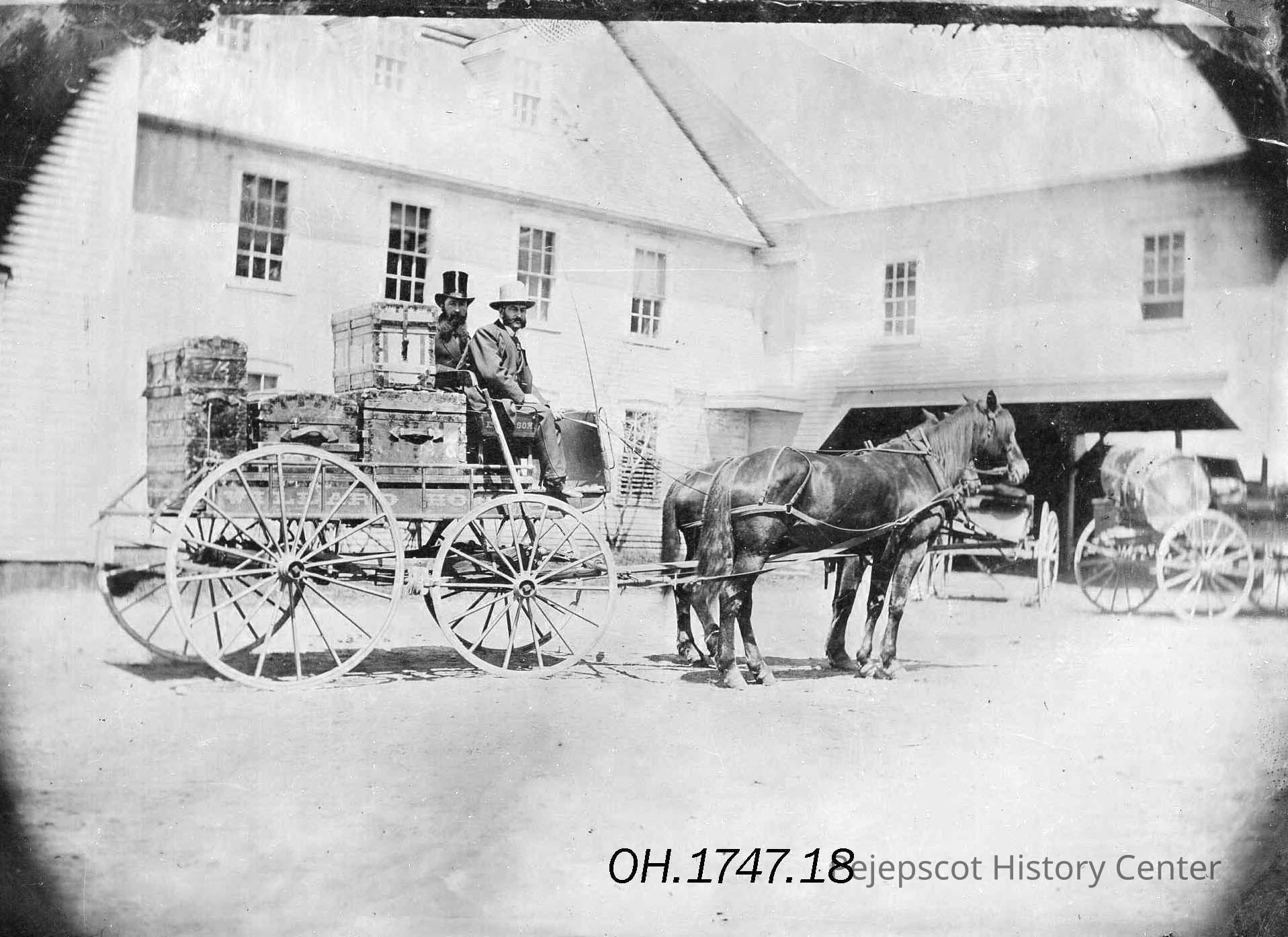 A B/W photograph (Tintype) depicting Alexander's Livery Stable. The wagon is loaded with suitcases and trunks and has "Willard House" printed on the side of the wagon.