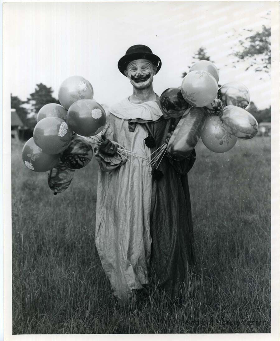 Alfred Neal dressed in clown uniform with balloons in both hands. Undated