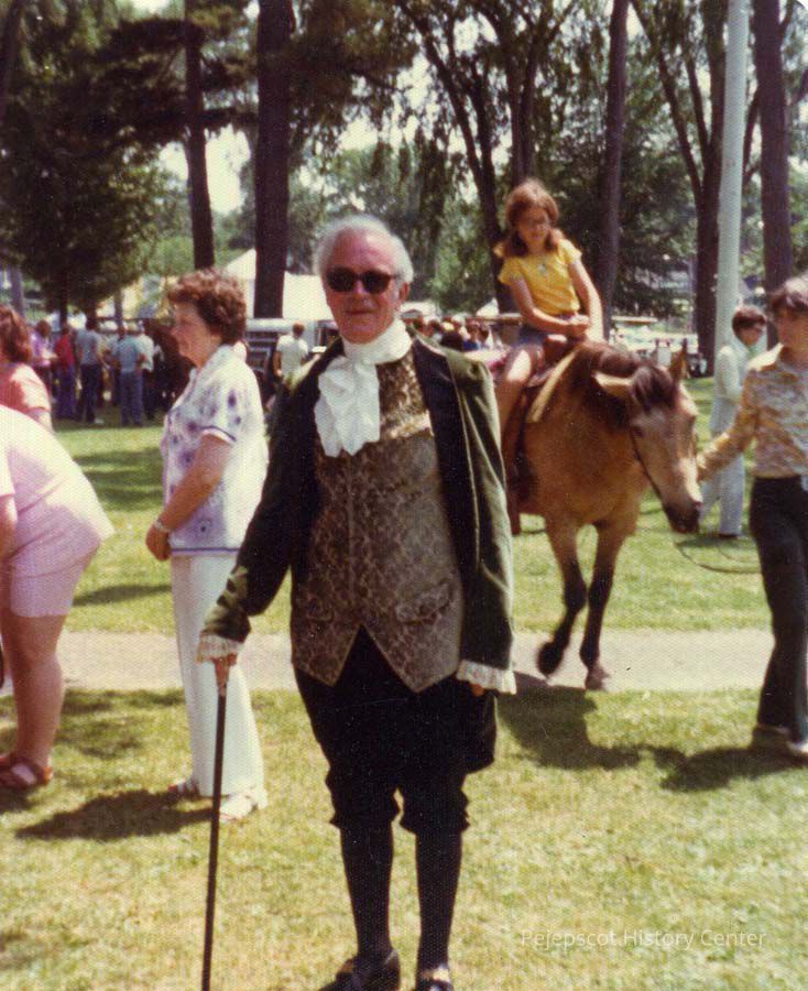 A photo of Alfred Senter dressed for the US Bicentennial celebration on the Mall, Brunswick, Maine. 7/4/1976