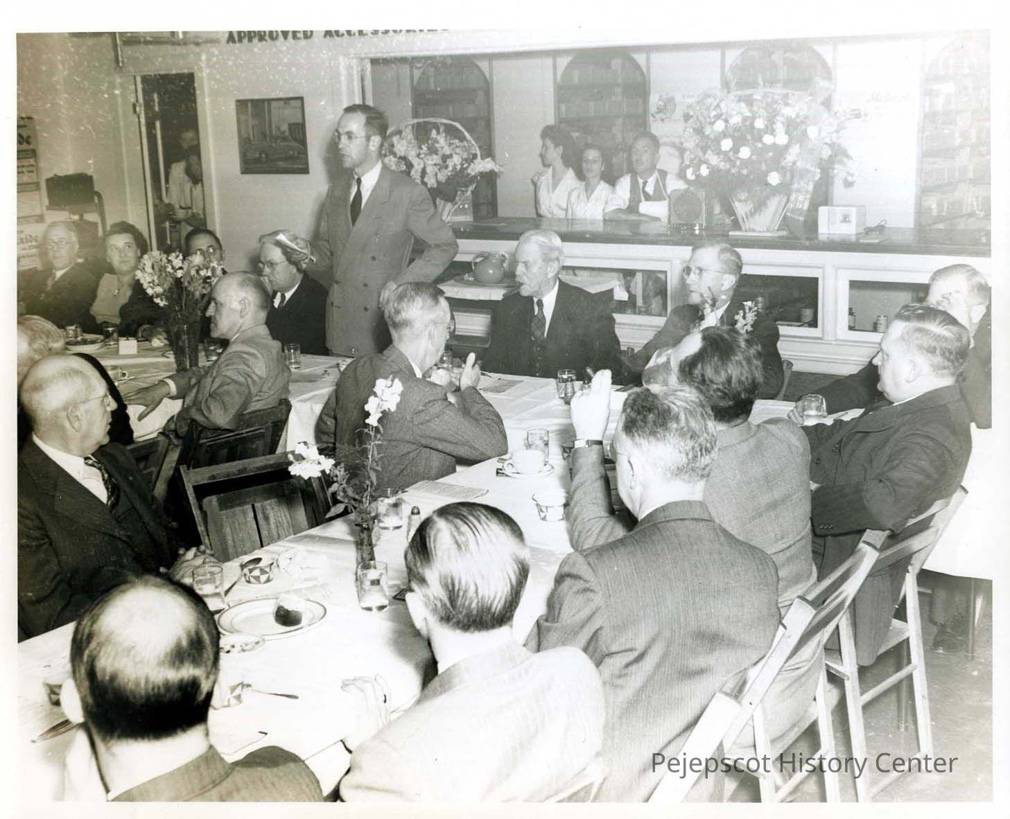 A group of men and women sit around a banquet table where they apparently have had a meal. Alfred Senter, holding a paper and standing, talks to the group. Others identified in the photo are: front, Harold Nickerson, Lawrence Brown next to the vacant chair, Bill Farrar at the second table, and Ellis Aldrich, Atty, beside Alfred Senter. Two waitresses and a waiter stand behind the counter on which sit two baskets of flowers. UndatedLexicon