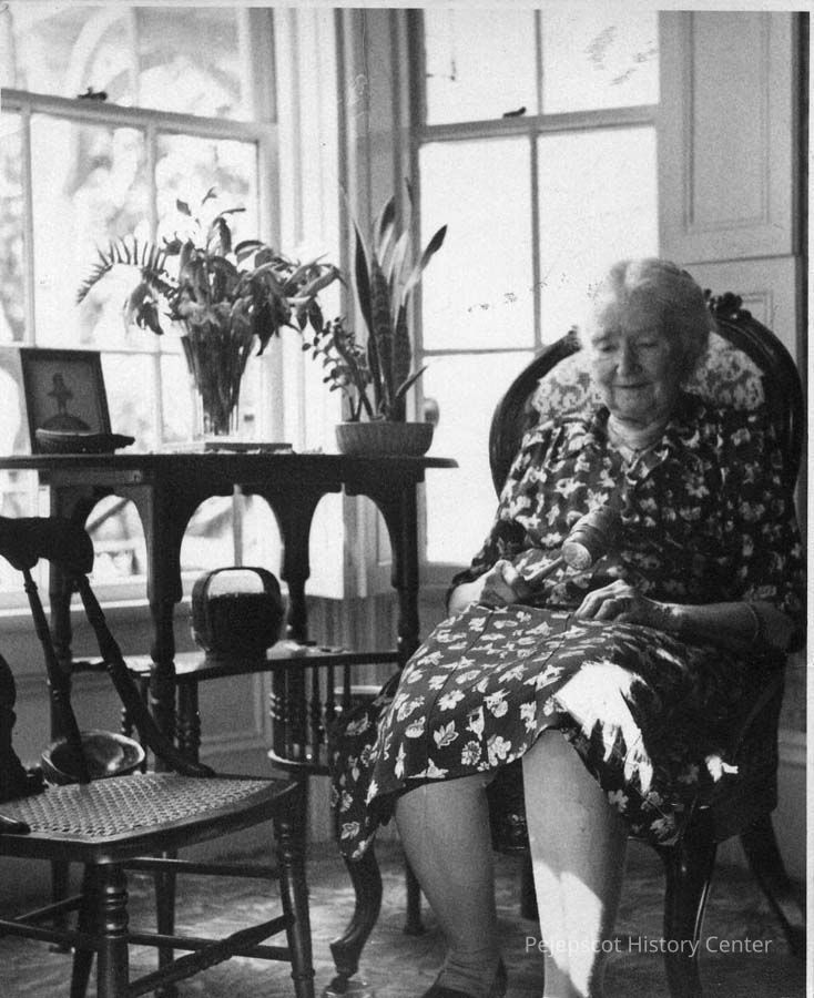 Black and white photograph of Alice Farrington, daughter of Sarah B. Chamberlain and Charles O. Farrington, and niece of Joshua L. Chamberlain. The photograph is taken in her home at 80 Chamberlain Street, Brewer.