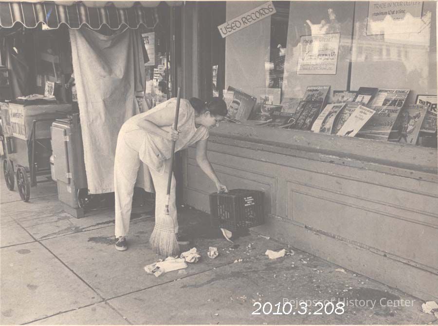 A B/W photograph of Alice Fiori of Kennebec Fruit Company sweeping up trash left by vandals. Photo published 8/1/1978. Undated