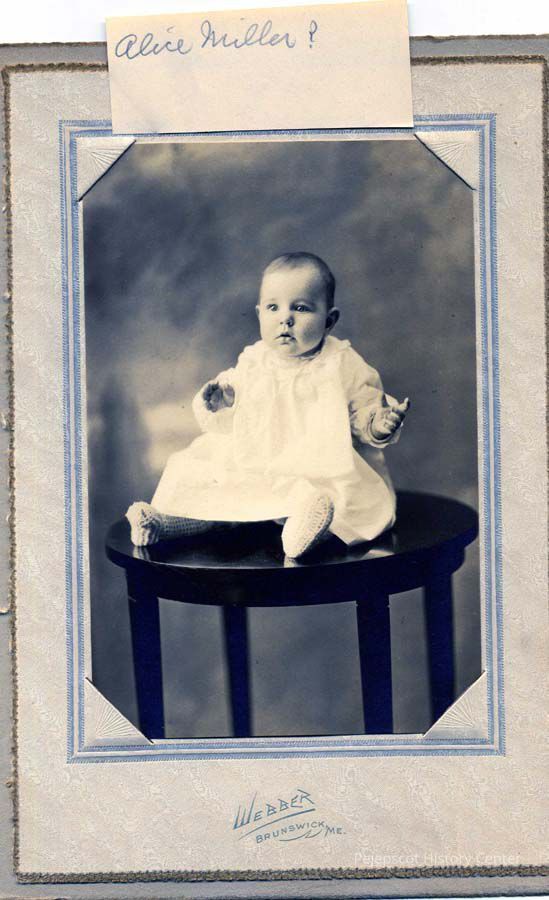 Black & white photograph of Alice Miller, note attached has name with ? - very young child seated on a table.