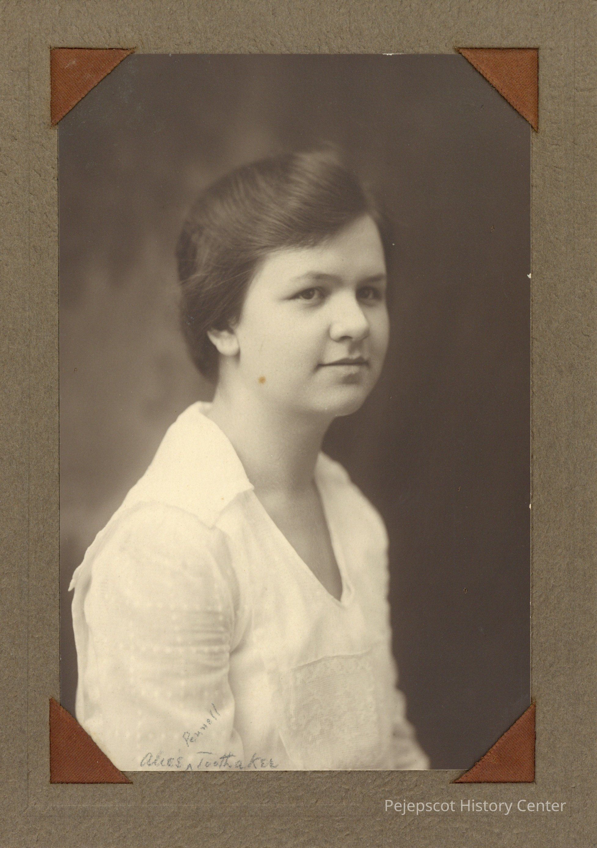 Matted, black and white portrait of Alice Pennell Toothaker. Her name is written in pencil on the front of the photograph.