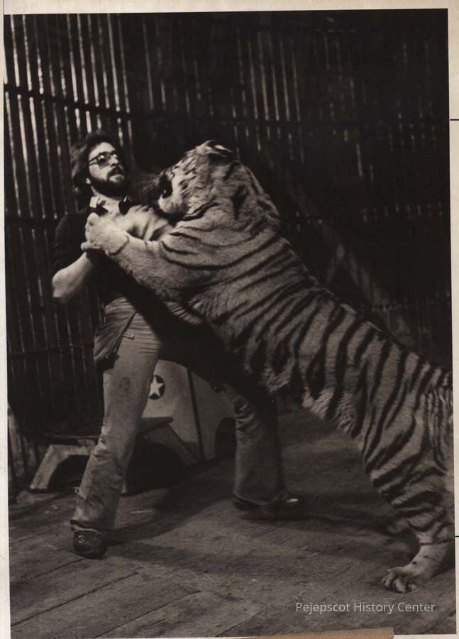 A black and white photo of Allen Gold and his tiger Maya was published in The Times Record in Brunswick, Maine, on 4/7/1980.