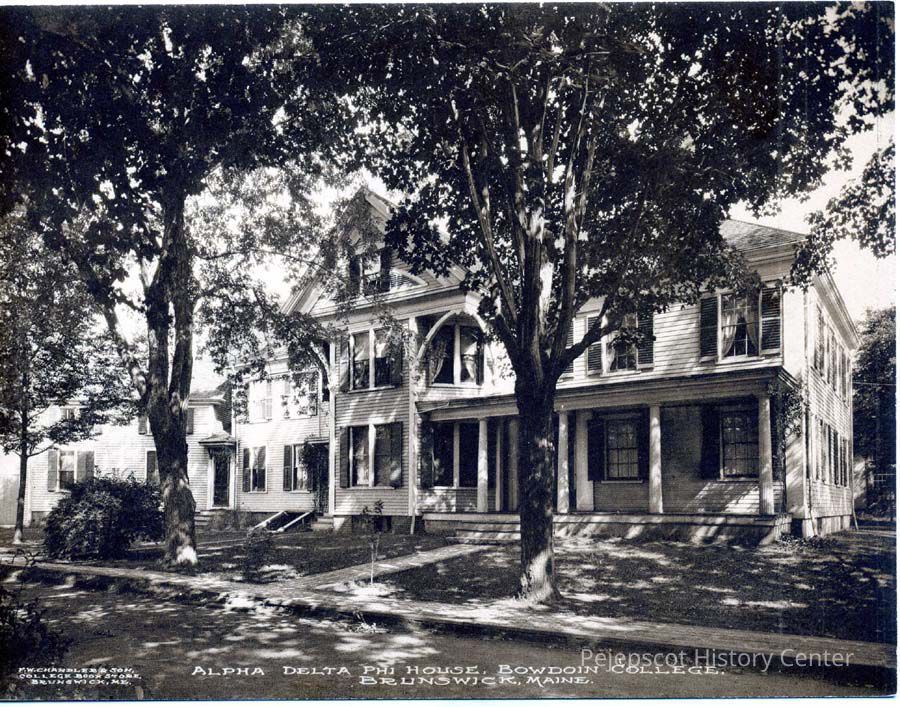 B/W postcard of the Alpha Delta Phi house at Bowdoin College, Brunswick, Me.