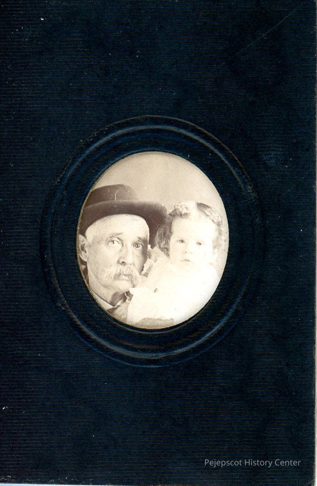 An oval image of an moustached older gentleman, Altheus Brown, and his infant grand-daughter, Thelma Eleona Cutler, taken during the summer of 1910 (according to the note on the back).