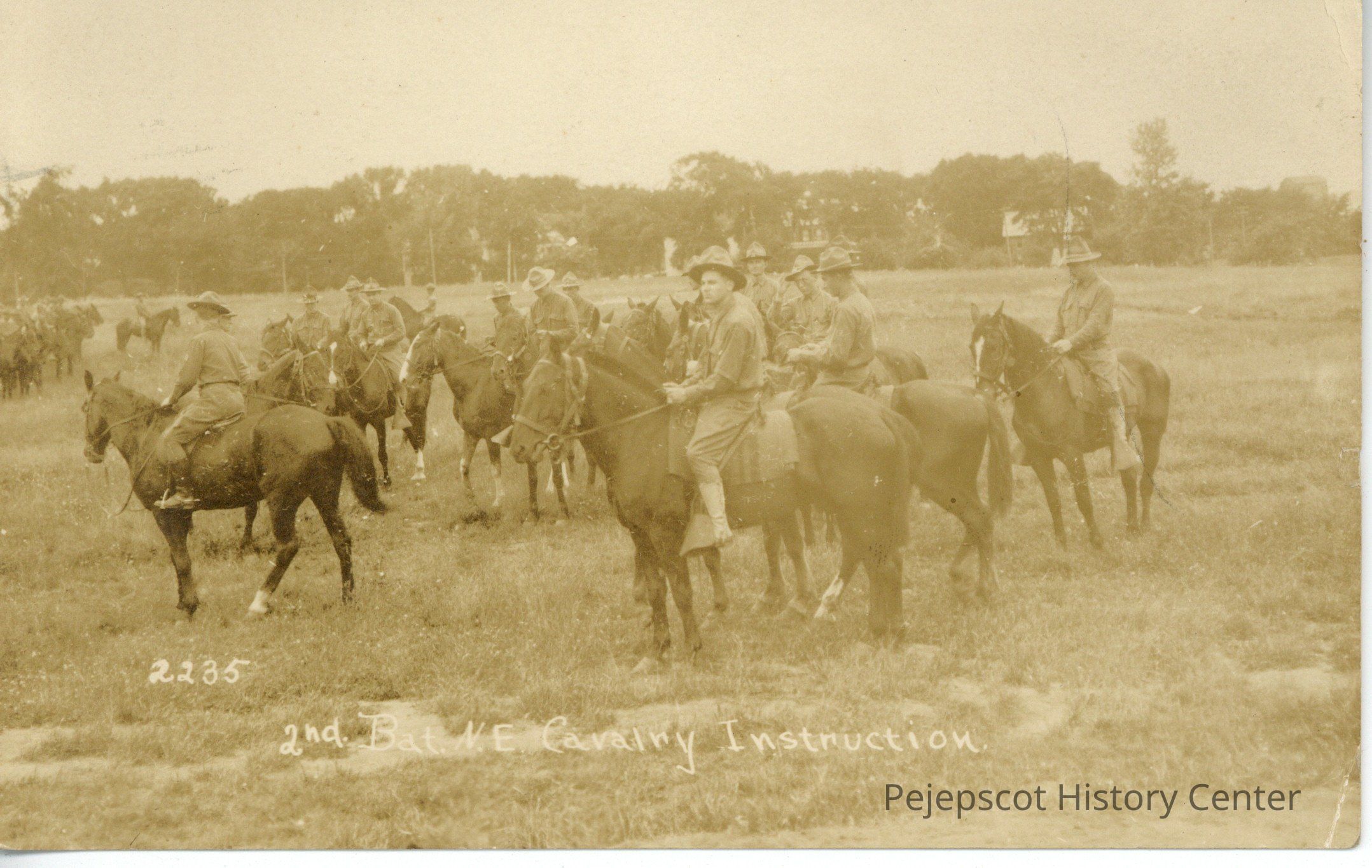 Photo postcard from likely from Dwight W. Pierce to Isabelle D. Olm. The photograph shows Dwight (likely center front) on horseback participating in the 2nd Bat. N.E. Cavalry Instruction during World War I.
