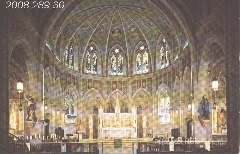 A color postcard view of the main altar and the sanctuary in the St. John the Baptist Catholic Church. The stained glass windows portray the Joyful Mysteries of the Rosary. UndatedCollection