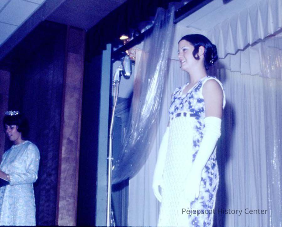 A 35 mm color slide of Althea Kinney, a contestant in the 1973 Miss Teen Queen Pageant. Doris Bernier, a former Teen Queen, is standing at the podium. The slide is marked, "5". Undated