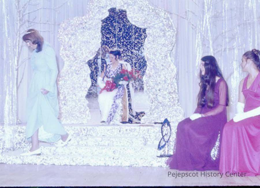A 35 mm color slide of the newly crowned 1973 Miss Teen Queen. Agnes Racine, 1972-73 Miss Teen Queen is descending the stairs on the left. Barbara Aldridge and Kathy Livernois are seated on the right. The slide is marked, "19". Undated