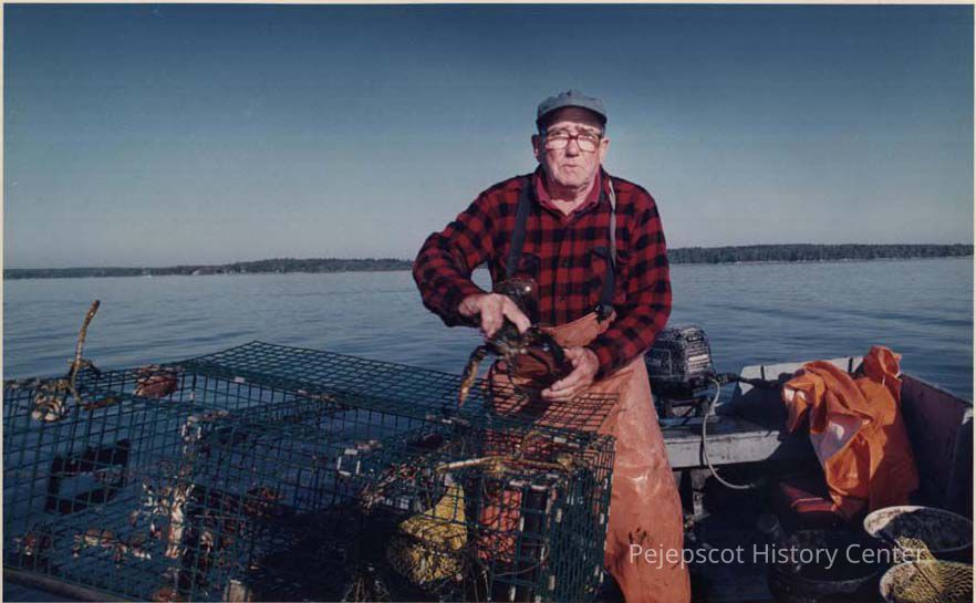 A color photograph of Alvah Holbrook with lobster traps on Casco Bay off Flying Point in Freeport was published in The Times Record in Brunswick, Maine, on 10/18/1991.