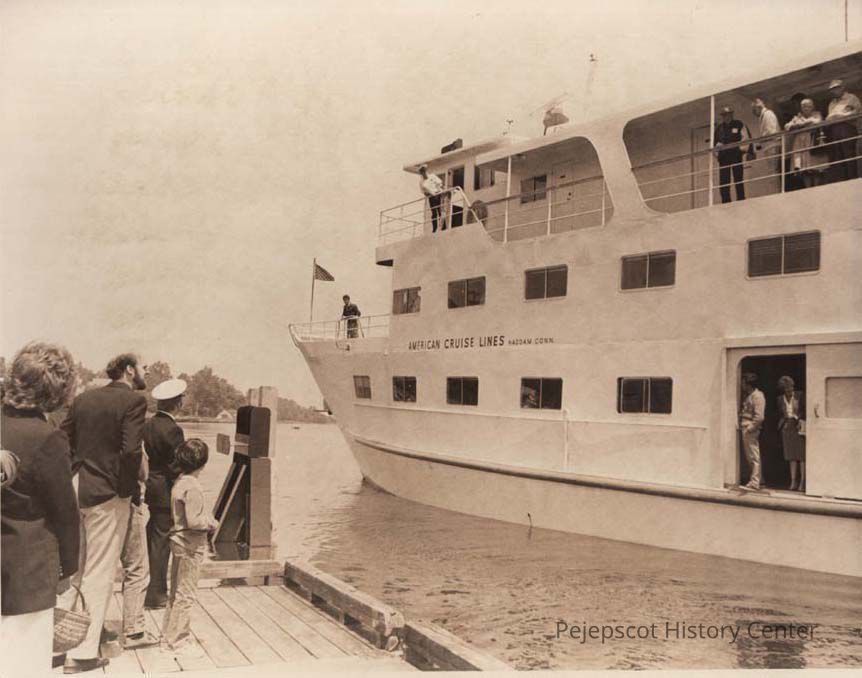 A black and white photo of the cruise ship American Eagle on the Kennebec River in Bath, Maine, is similar to 2003.546.3.753., 2003.546.3.755, 2003.and 546.3.756, which was published in The Times Record in Brunswick, Maine, on 6/24/1982.Collection