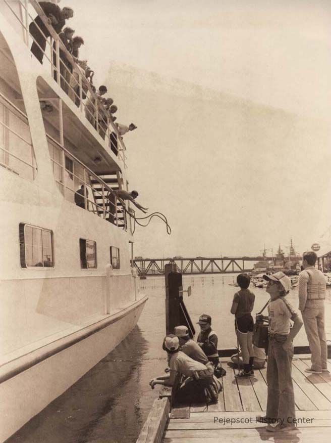 A black and white photo of the ship American Eagle on the Kennebec River in Bath, Maine, is similar to 2003.546.3.753., 2003.546.3.754, 2003.and 546.3.756, which was published in The Times Record in Brunswick, Maine, on 6/24/1982.Collection