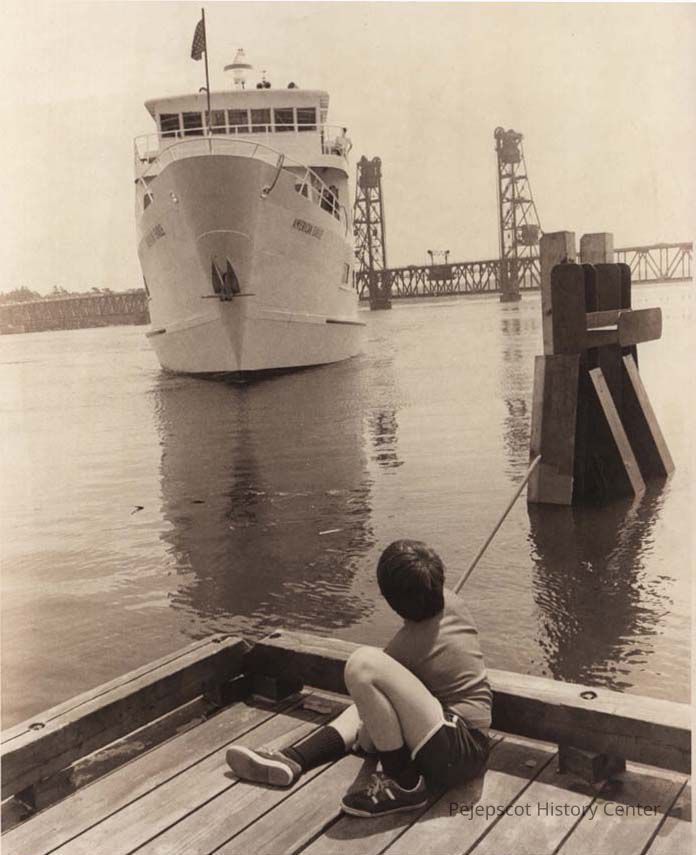 A black and white photo the cruise ship American Eagle pulling up to a dock in Bath was published in The Times Record in Brunswick, Maine, on 6/24/1982. For other views see 2003.546.3.753, 2003.546.3.754, 2003.and 546.3.755.
