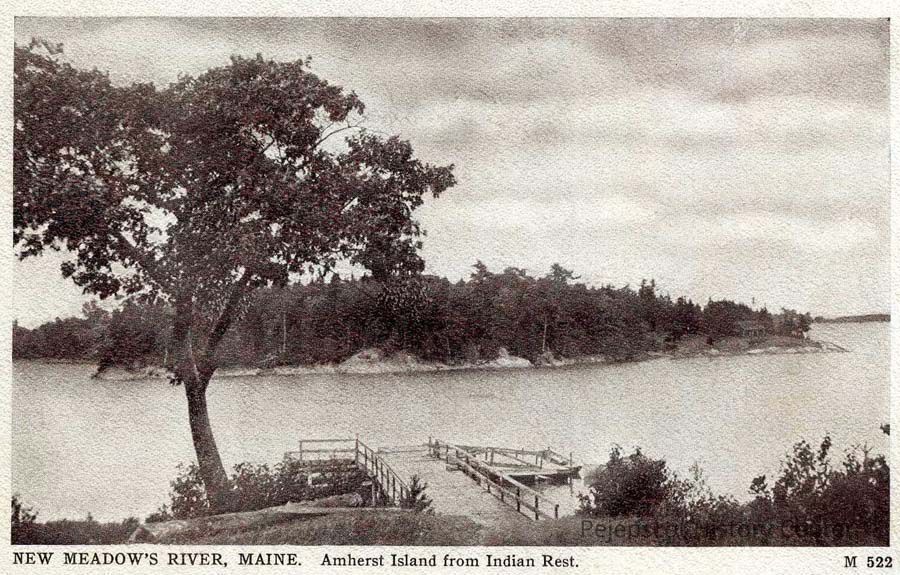 A B/W postcard of Amherst Island and the New Meadow River taken from Indian Rest, New Meadow's River, ME. Amherst Island was owned by Samuel Furbish. Furbish was the Assistant Treasurer for Bowdoin College, Treasurer-Trustee for Bowdoin College, Chairman of Brunswick's Board of Assessors, then Elected Vice-President of Maine Assessors' Association, among other titles. Undated.Lexicon