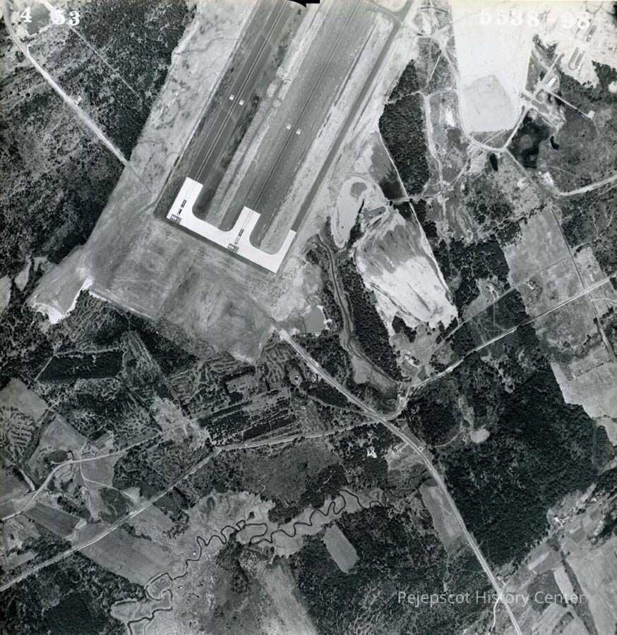 A B/W aerial photograph of the end of the runways at BNAS. 5/4/1953.