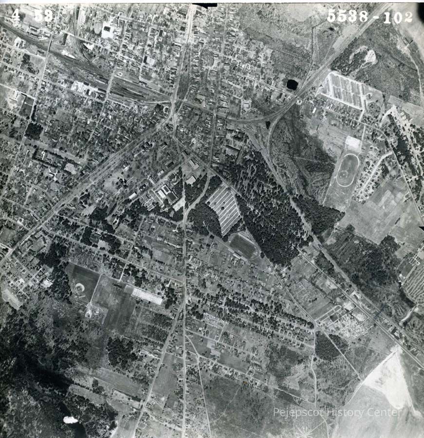 A B/W aerial photograph of Brunswick. and Bowdoin College. 5/4/1953.