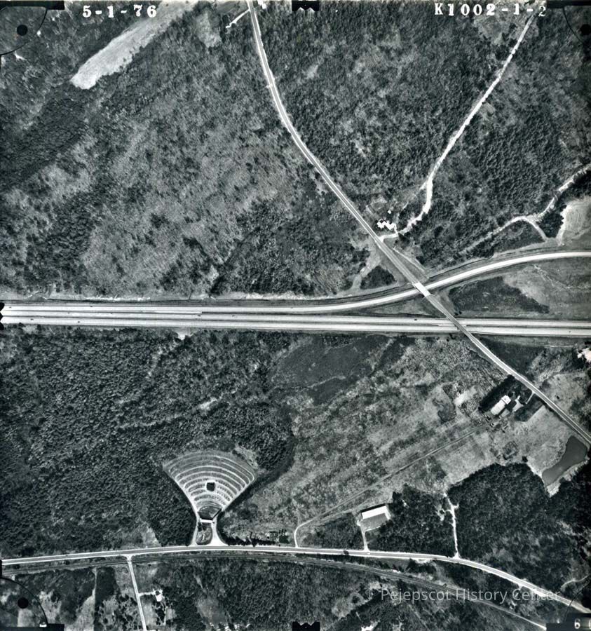 A B/W aerial photograph of I 295 and the Brunswick Drive In. 5/1/1976.