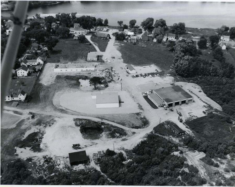 A B/W aerial photograph of Industry Road. Public Works and Times Record Building can be seen. Water Street and the Androscoggin River can be seen in the back ground.