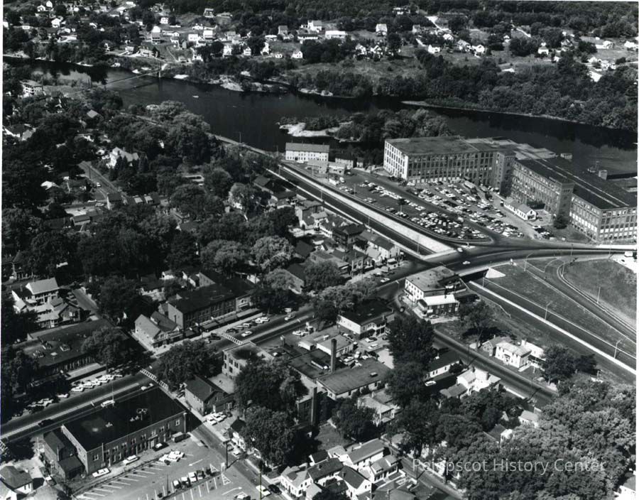 An aerial photo of Maine St. facing Northwest with Androscoggin River at rear. c. 1970