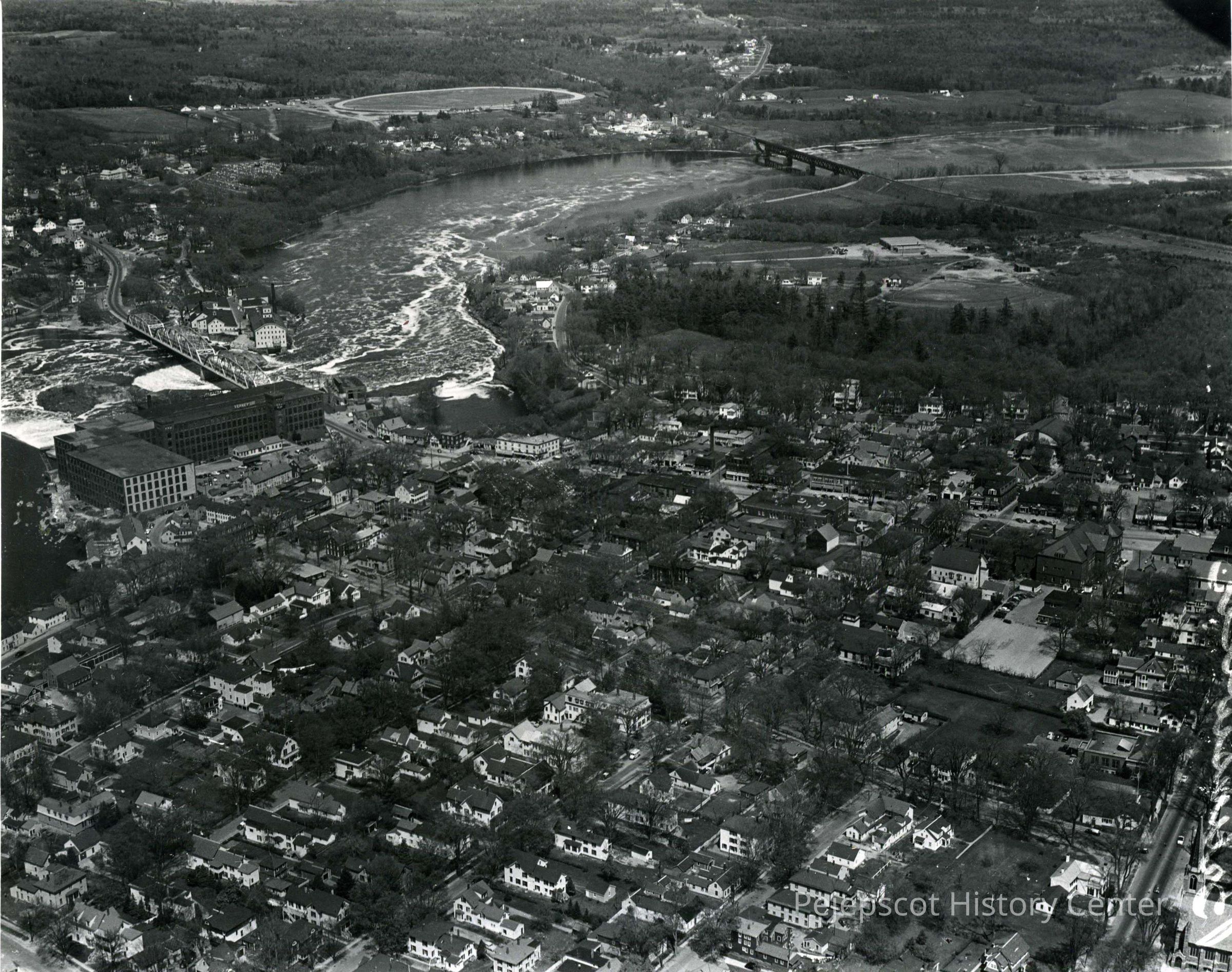 An aerial photo of Maine Street and the Cabot Mill. c. 1940
