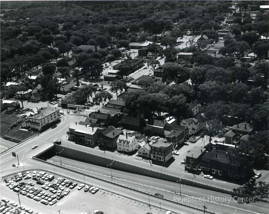 An aerial photo of Maine Street and the Route 1 by-pass. c. 1970