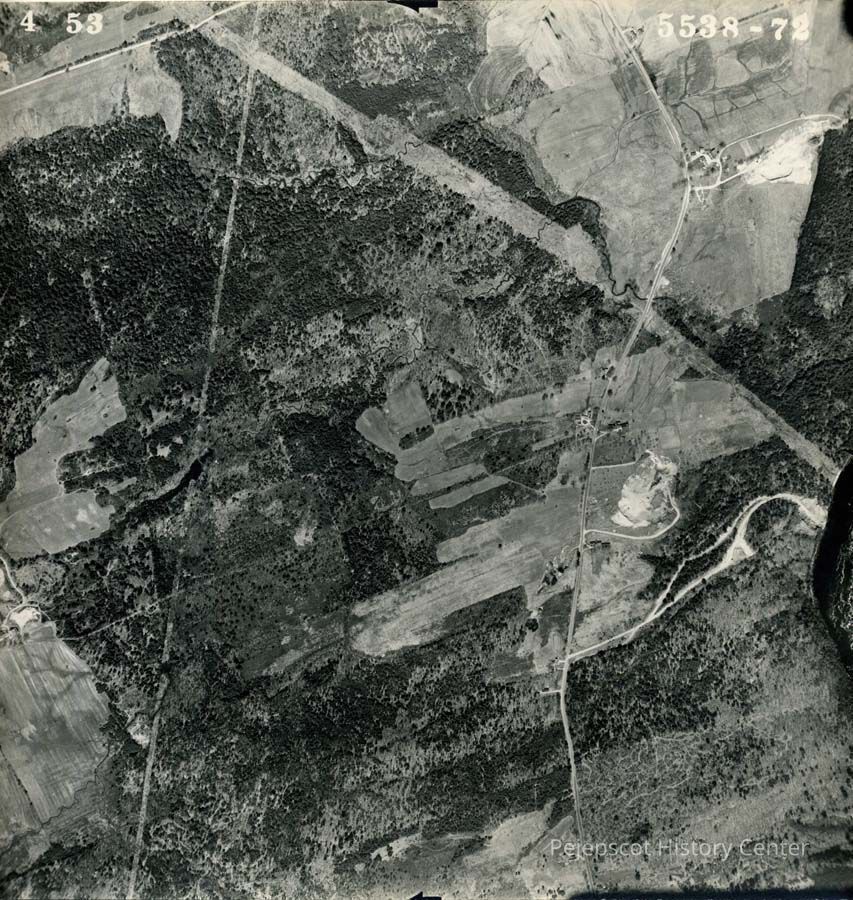 A B/W aerial photograph of River Road and what is today (2013) known as the Pejepscot Fishing Park. 5/4/1953