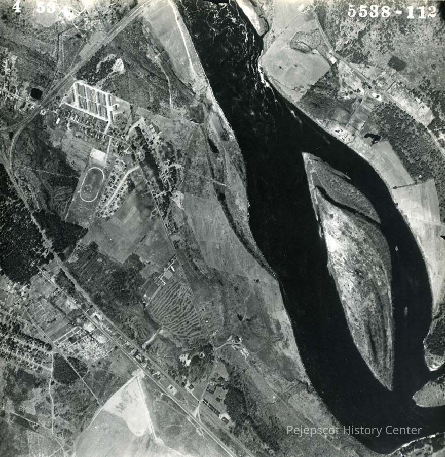 A B/W aerial photograph of the Androscoggin River and Cow Island. 5/4/1953. Cow Island was a landing place for lumber-laden ships.
