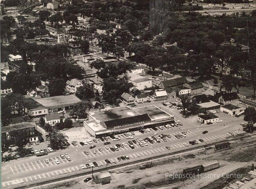 An aerial photo of the area near the train tracks and Maine Street. Cottles store and the Eagle Hotel can be seen..Ca 1965.