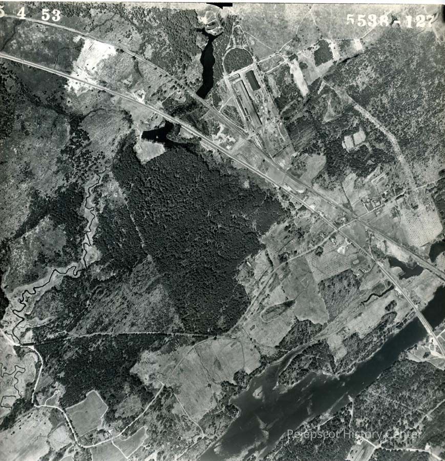 A B/W aerial photograph of the New Meadows River, Old Bath Road and the Hardings Plant. 5/4/1953.