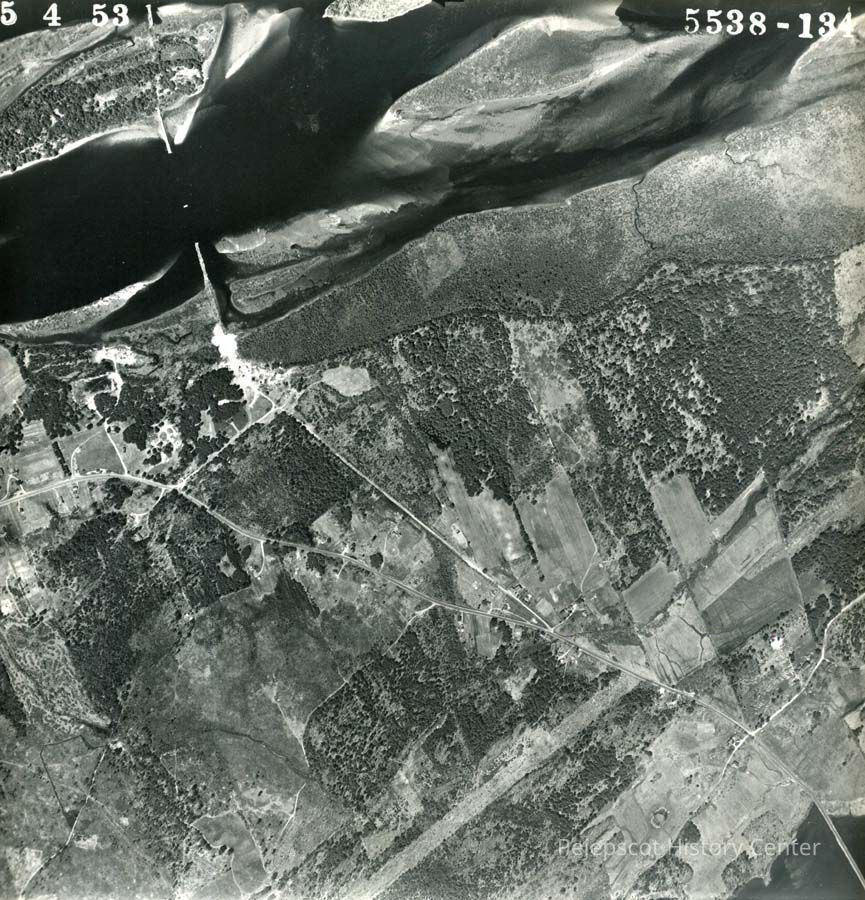A B/W aerial photograph of an area in the Androscoggin River and some of the islands. 5/4/1952