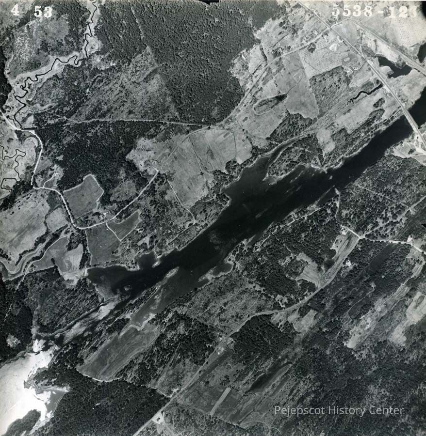 An aerial photograph of the New Meadows River and the Old Bath Road. 5/4/1953.