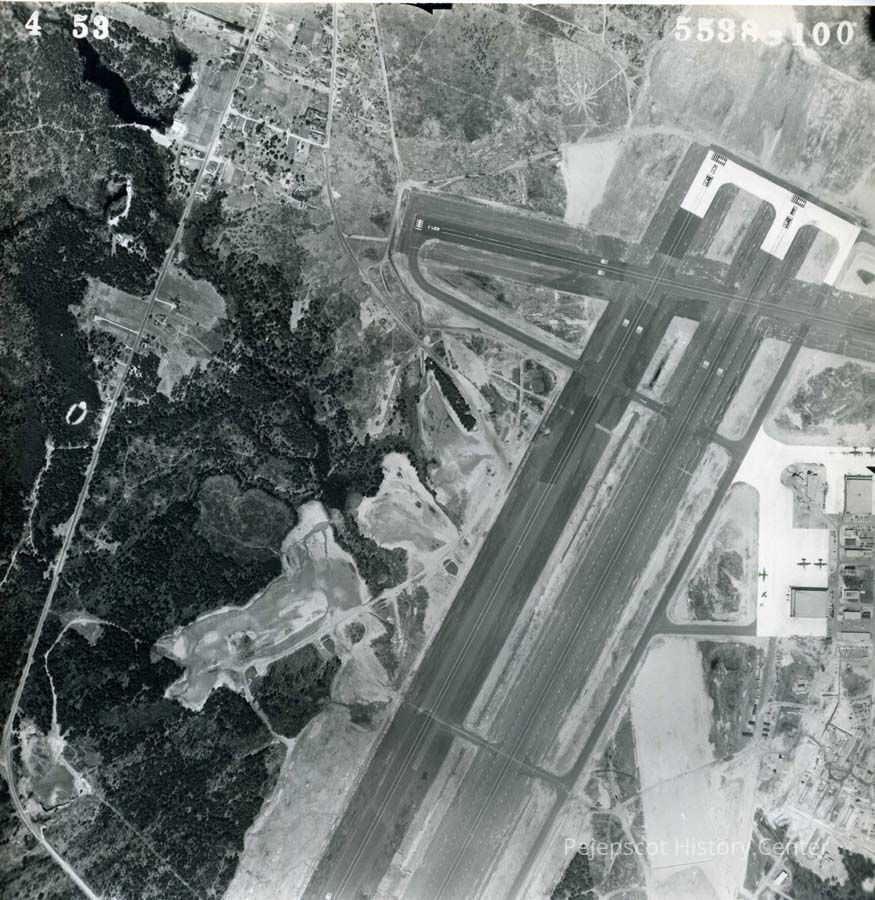 A B/W aerial view of Brunswick showing the Naval Air Station runways. 5/4/1953.