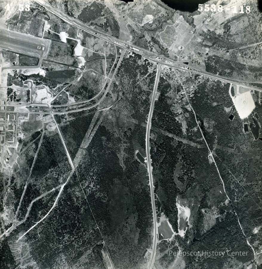 A B/W aerial view of Cook's Corner, BNAS and the Old Bath Road. 5/4/1953.
