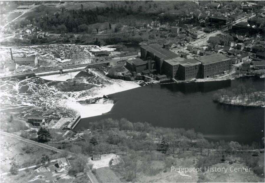 A B/W aerial view of the Androscoggin River, showing the Cabot Mill and the Frank J. Wood Bridge..