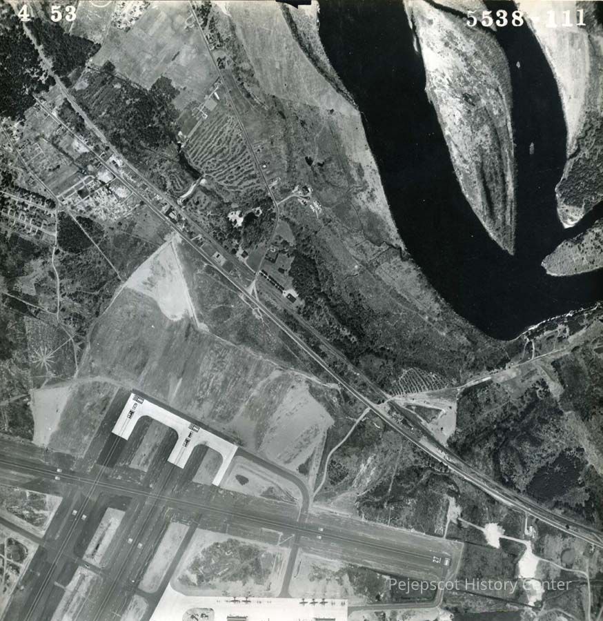A B/W aerial photographic view of the Old Bath Road, the end of the runways at BNAS and Cow Island in the Androscoggin River. 5/4/1953.