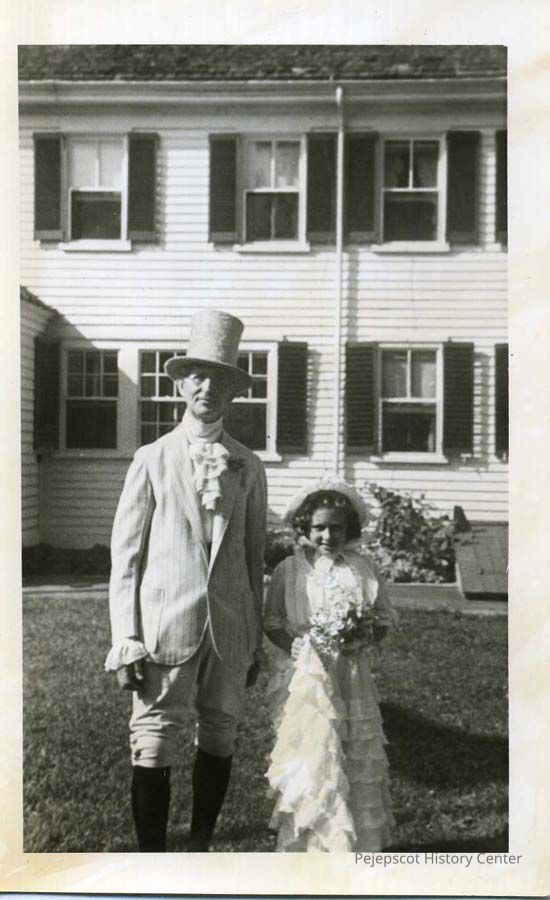 A B/W photograph of an unknown man and girl dressed in historic costume for the Brunswick Bicentennial. Dated 1939.