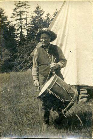 B/W photo of Andrew Alexander holding drum. Back says, "Andrew Alexander b. 1841 - d. 1919. In service 1862 - 1865." c. 1862.