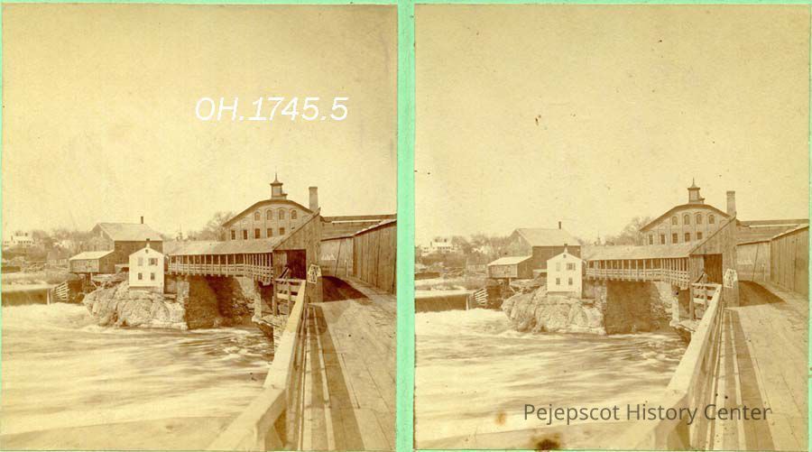 A stereo view photo of the Androscoggin Bridge and Toll House, Brunswick, ME. Scribner's Mill in Topsham can be seen in the background. Not dated but before Iron Bridge, which was built between 1871-1877.