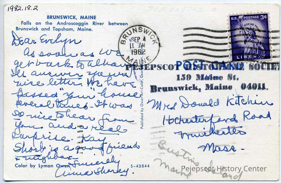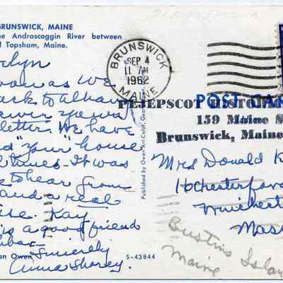 Postmarked Brunswick, ME 09/04/1962, from Anna Shorey to Mrs. Donald (Evelyn) Kitchin of Winchester, MA.Lexicon