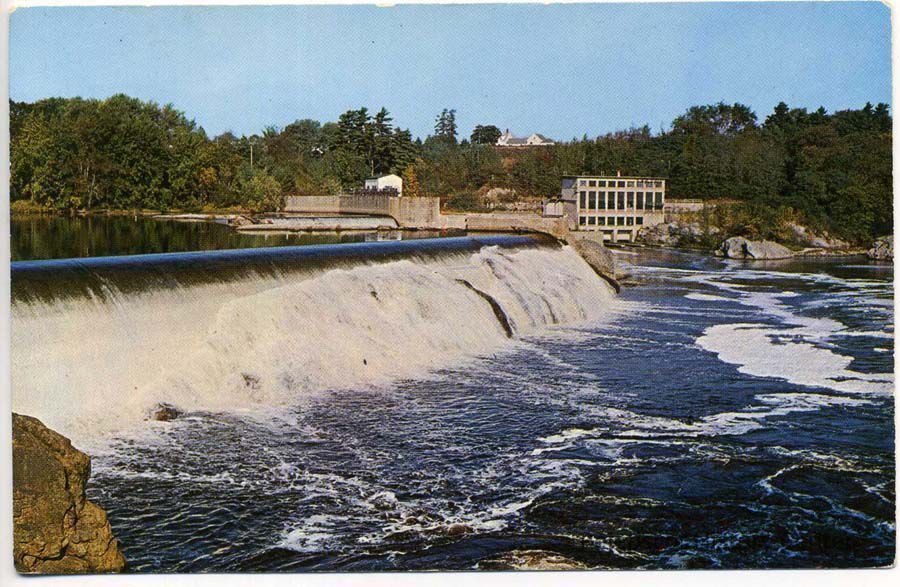 A color postcard of the Falls on the Androscoggin River between Brunswick and Topsham.