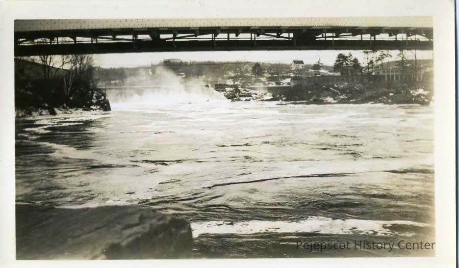 A black and white photo of the Androscoggin Falls taken from down river during the 1936 flood.