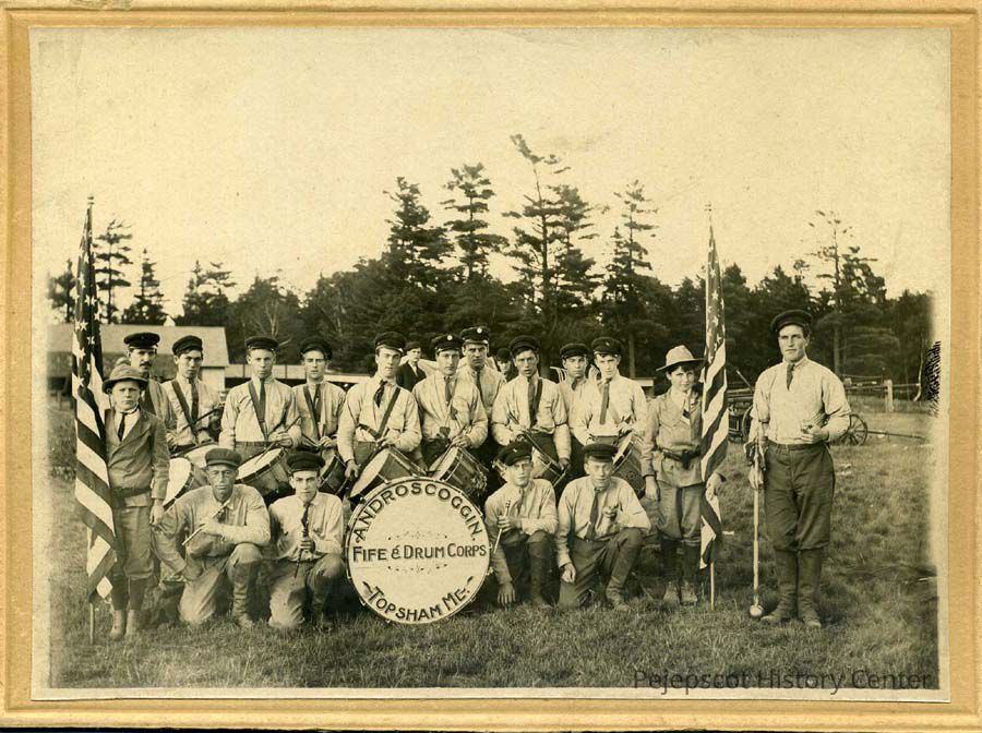 A B/W photo of the Androscoggin Fife & Drum Corps, Topsham, Maine. At the Topsham Fair, October 1912. "to Geo. Sinclair 1940" in pencil on back.