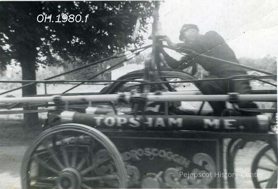 A B/W photograph of the Androscoggin hand-tub with Bill Alexander working on it. Topsham, ME. Not dated.