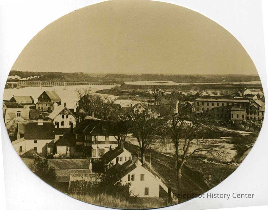 A black and white oval photo of the Androscoggin River from Summer Street, Topsham. No Date.