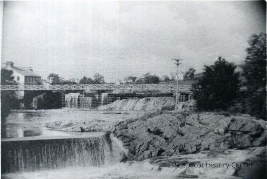 B/W photo of the Androscoggin River, with bridge to the power station. No date.